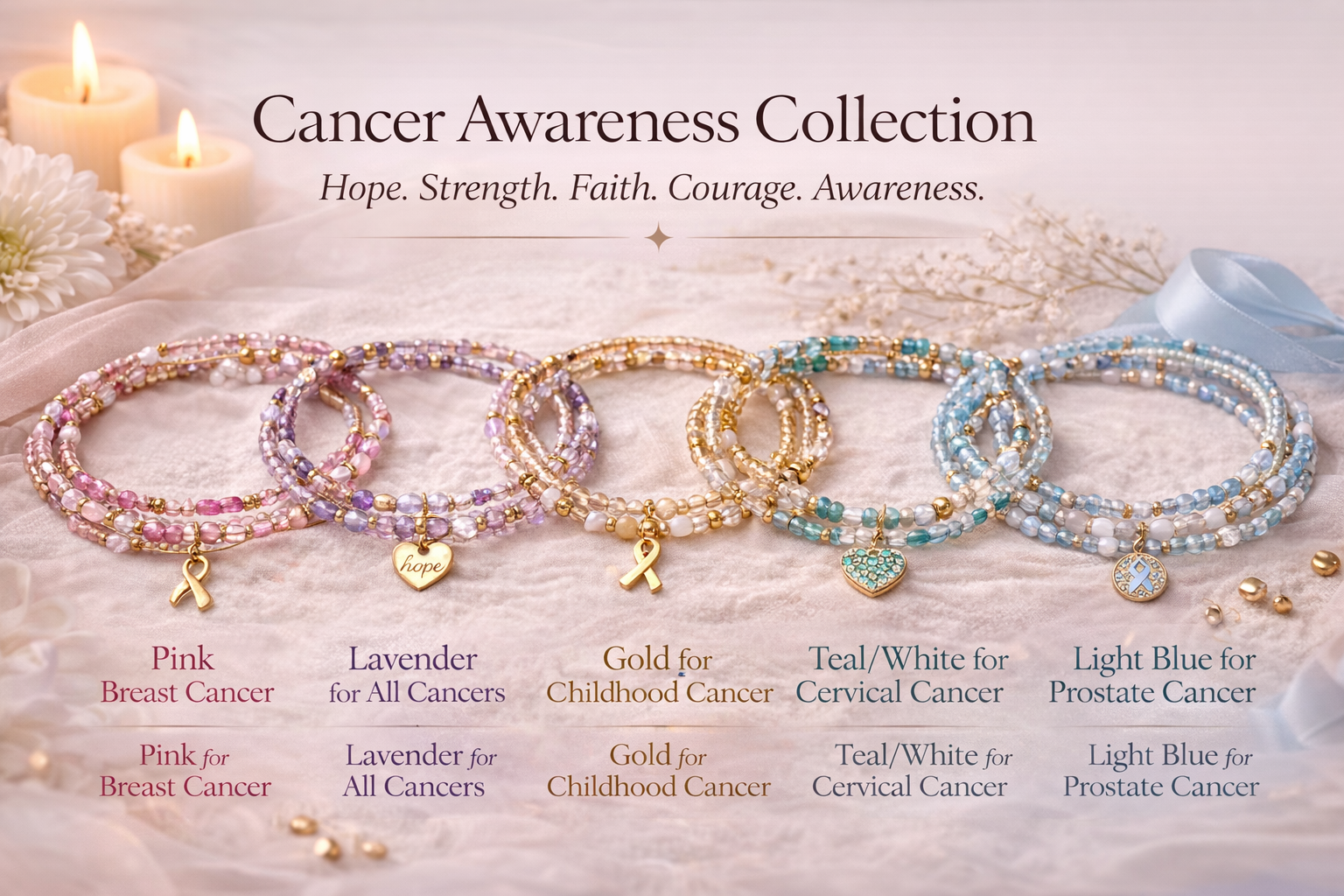 The Cancer Awareness Collection is a meaningful bracelet collection designed to honor strength, raise awareness, and reflect the unique color symbolism connected to different cancer journeys. Each bracelet is thoughtfully styled in awareness-inspired tones, allowing every piece to carry its own message of hope, support, remembrance, and resilience.