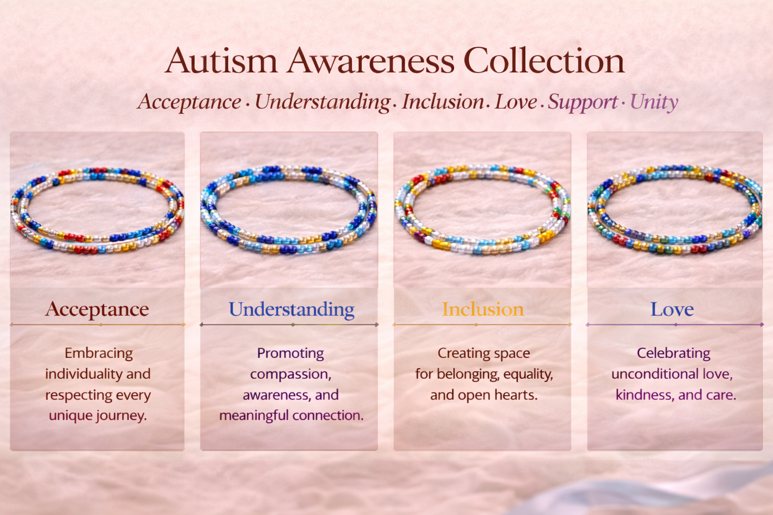 This collection focuses on symbolism through color rather than charms, making each piece clean, elegant, and easy to wear. Every variation reflects a different message—Acceptance, Understanding, Inclusion, Love, Support, and Unity—while embracing vibrant combinations that feel expressive, meaningful, and visually unique.